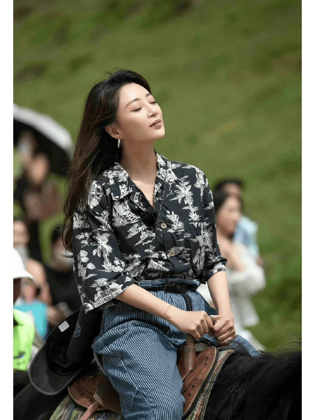 当然啦,这套造型的灵魂还得是半扎发。她没搞那种紧绷的大光明,也没让头发乱糟糟披着,而是取头顶三分之一的头发轻轻扎起,两边留几缕碎发修饰脸型。从正面看,露出清晰的眉眼特别精神;从侧面看,颅顶高度瞬间起来了,脸型显得又小又流畅。就这么轻轻一扎,46岁可能有的“姨味”全没了,只剩下少女般的清爽感。难怪网友都说,殷桃这哪是换发型,简直是换了个人! 其实殷桃的穿搭一直很有借鉴意义。之前她穿黑底白花的复古印花衬衫配条纹阔腿裤,细碎的植物纹样低调又灵动;还有灰色小套装,黑色修身上衣配西装裤,裤脚的屁帘装饰瞬间提升高级感。她从不盲目追潮流,而是选适合自己的基础款,靠版型和细节赢质感。对咱们中年女人来说,与其跟风买爆款,不如学殷桃这样——选对版型、做好搭配,普通单品也能穿出惊艳效果。