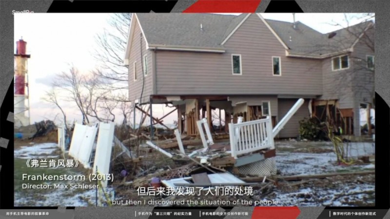 2013年,弗莱肯风暴袭击泽西海岸,当时身为莫纳什大学访问研究员的MaxSchlezer,在冬日海岸散步时看到成片废墟。他用iPhone记录下这一场景,并让当地学生讲述飓风如何摧毁建筑、改变生存环境,这部作品于2014年完成,并在新西兰坎特伯雷电视台播出后获得成功。尽管影片存在曝光过度的技术瑕疵,但当镜头里的人哭诉“无家可归,不知道去哪里”时,没人会在意这些瑕疵——手机拍摄让传统导演思维被颠覆,创作者不再机械执行拍摄,而是用镜头与社区对话,将叙事决定权交还给故事主人公。
